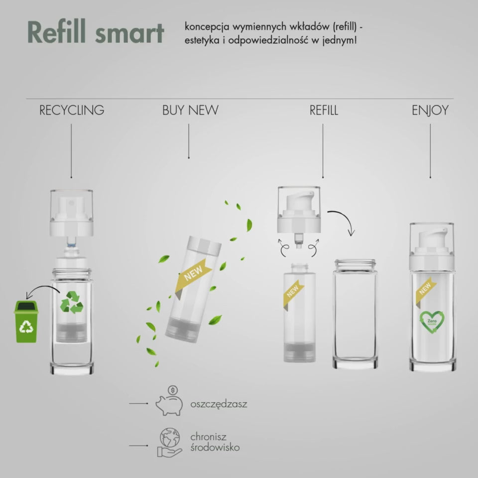 Koncepcja wymiennych wkładów (refilli) to odpowiedź na potrzeby nowoczesnej pielęgnacji – ekologicznej, ekonomicznej i świadomej. Kiedy zużyjesz krem, nie musisz kupować nowego opakowania – po prostu wymieniasz recyklingowalny refill, który perfekcyjnie pasuje do Twojego szklanego flakonu.