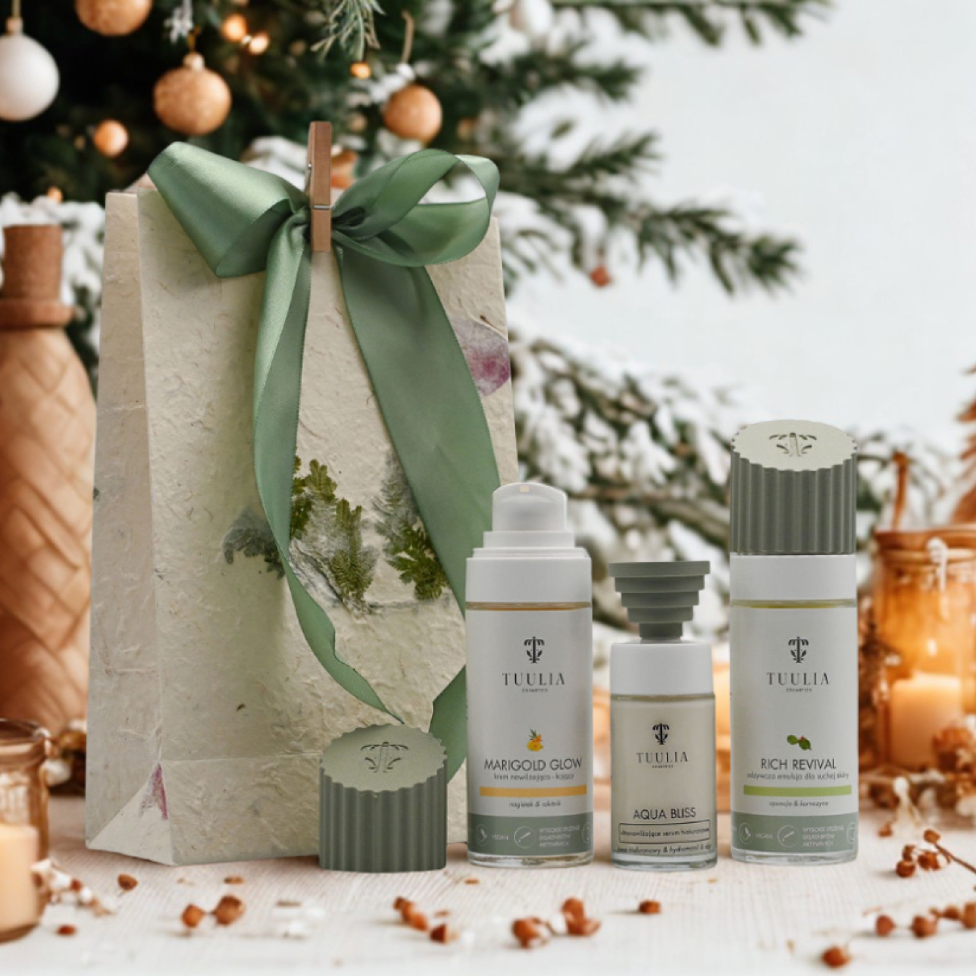 Rozbudowany zestaw prezentowy z trzema pełnowymiarowymi, naturalnymi kosmetykami Tuulia – serum Aqua Bliss, kremem Marigold Glow i bogatą emulsją Rich Revival. Kompletny rytuał intensywnego nawilżenia i odżywienia skóry, idealny na dzień i na noc, szczególnie w sezonie jesienno-zimowym. Całość zapakowana w stylową torbę z czerpanego papieru i uzupełniona stylowym lusterkiem Tuulia. Prezent, który wygląda wytwornie i od razu nadaje się do wręczenia.