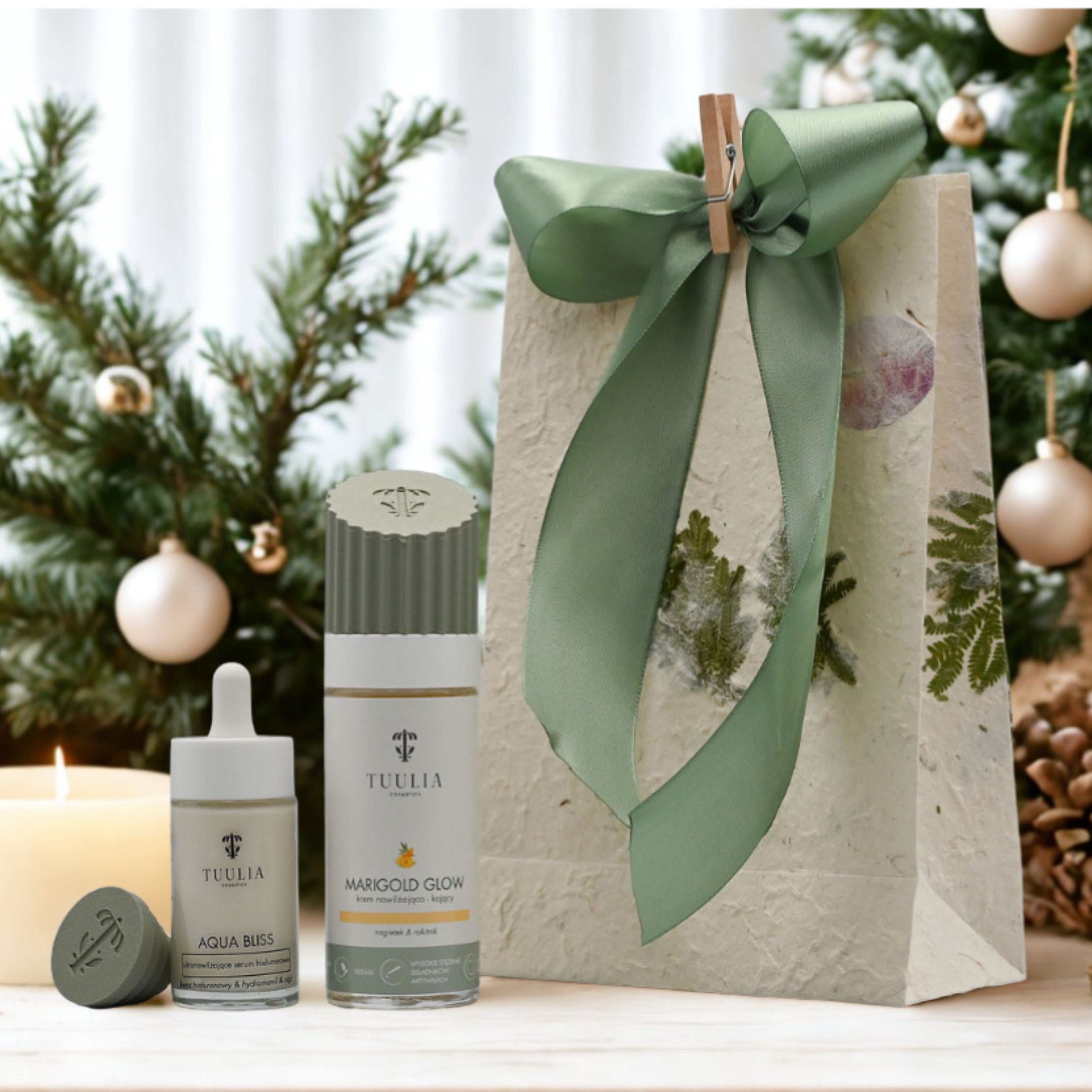 Elegancki zestaw prezentowy z dwoma pełnowymiarowymi, naturalnymi kosmetykami Tuulia – serum Aqua Bliss i kremem Marigold Glow. Gotowy rytuał nawilżenia dla skóry spragnionej komfortu, zapakowany w stylową torbę z czerpanego papieru. Prezent, który wygląda szlachetnie i od razu nadaje się do wręczenia.