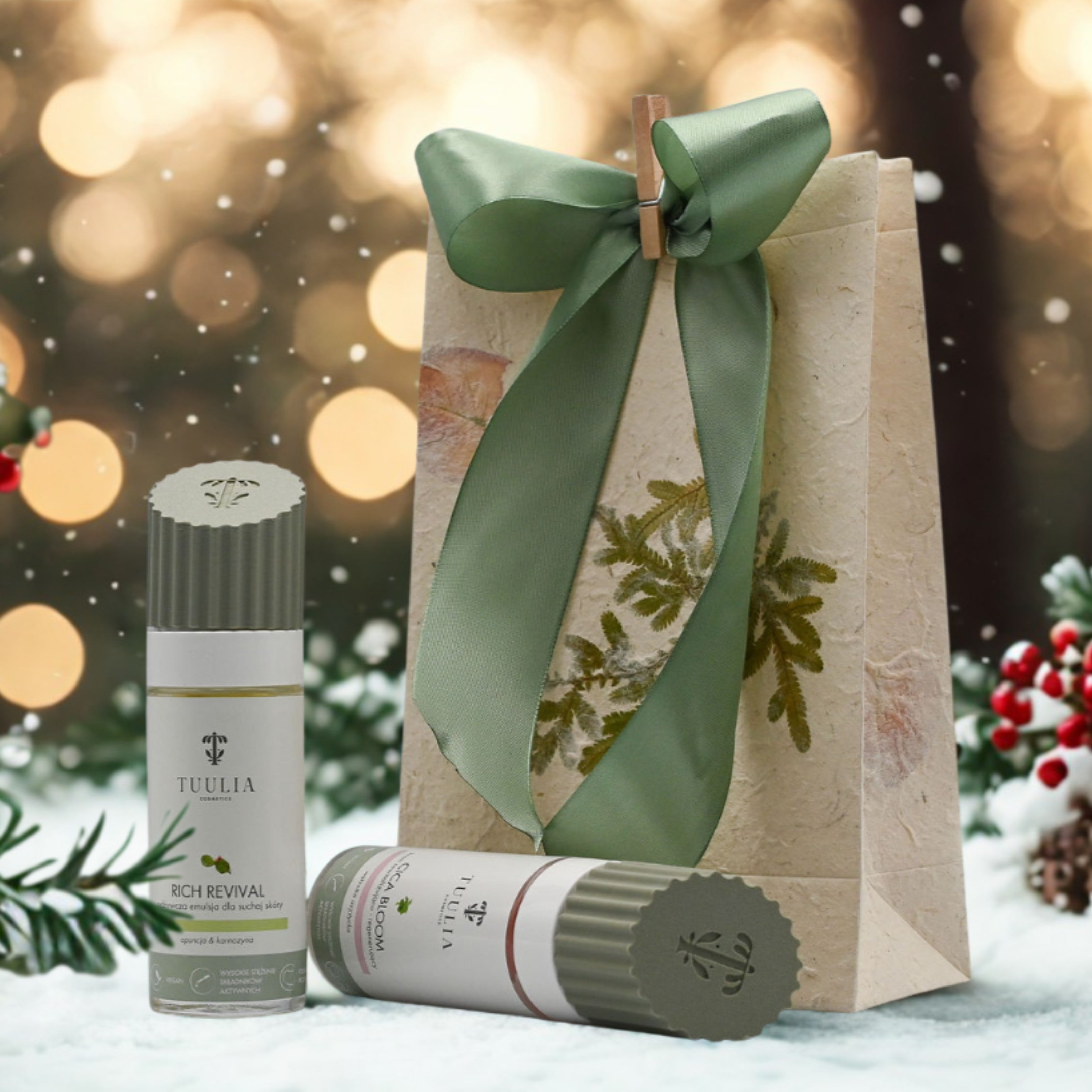Elegancki zestaw prezentowy z dwoma pełnowymiarowymi, naturalnymi kosmetykami Tuulia – kremem Cica Bloom i odżywczą emulsją Rich Revival. To dopracowany rytuał odnowy dla skóry dojrzałej, która potrzebuje regeneracji, wzmocnienia i przywrócenia jedwabistej miękkości. Całość zapakowana w torbę z czerpanego papieru i dopełniona autorskim lusterkiem Tuulia. Prezent, który wygląda szlachetnie i od razu nadaje się do wręczenia.